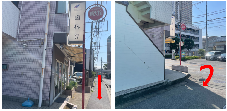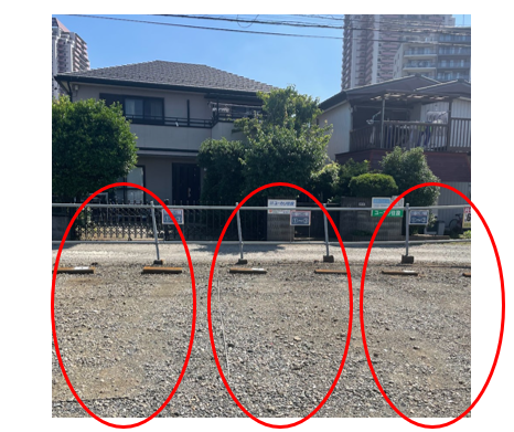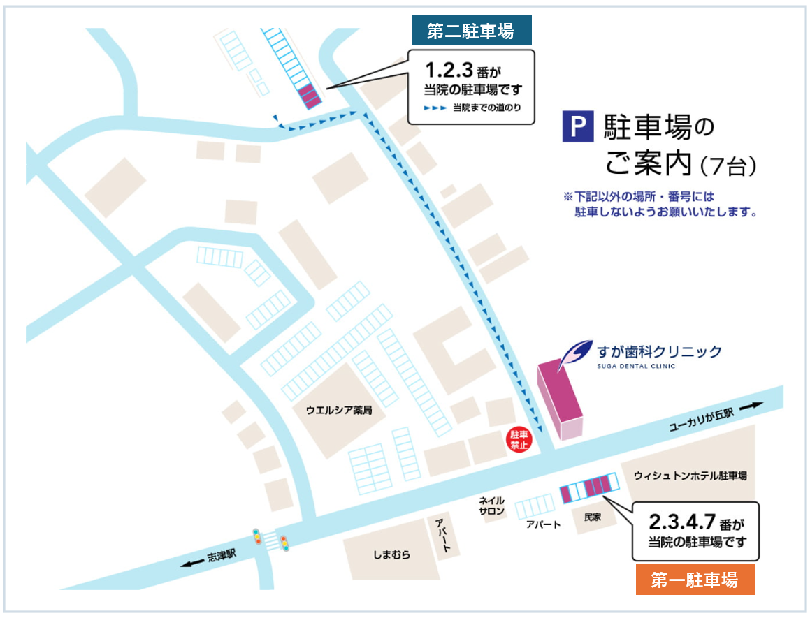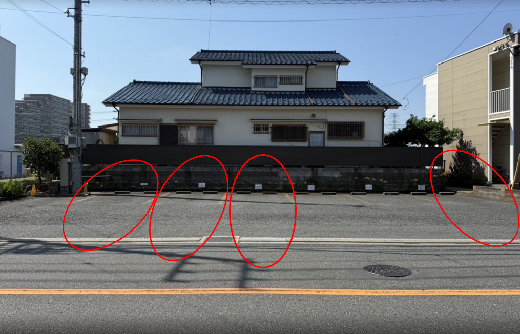 赤丸で囲った2.3.4.7番が当院の駐車場です。