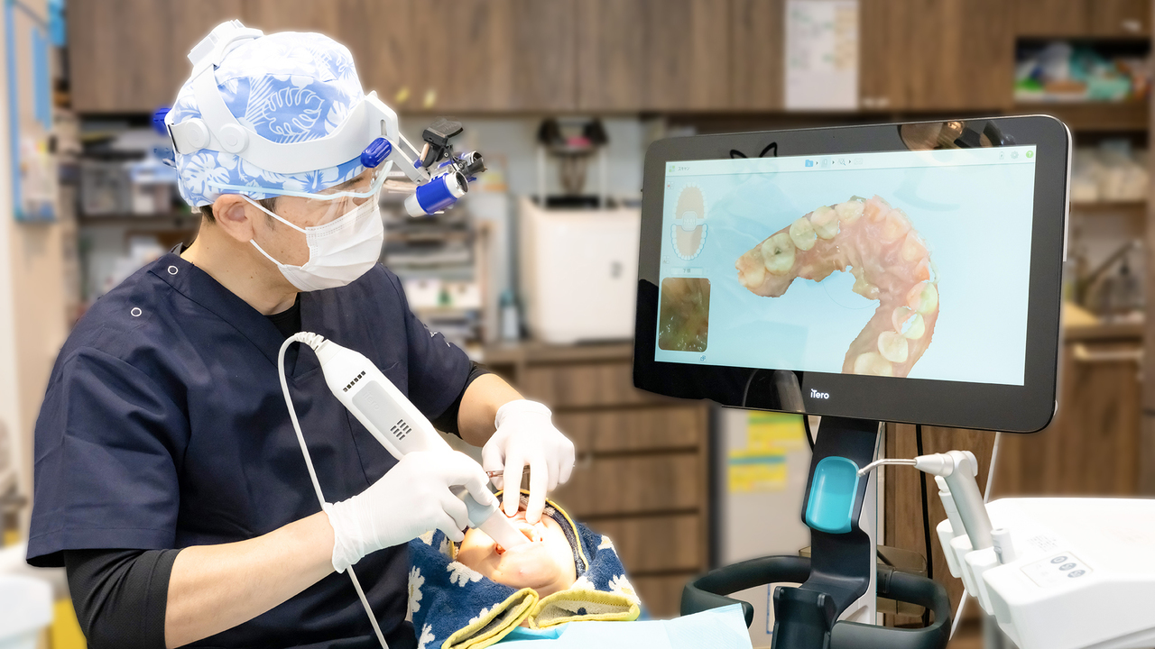 院長がお口の診察を行い、続いて最新の口腔内スキャナー「iTero(アイテロ)」を使って、患者さまの歯をスキャンします。